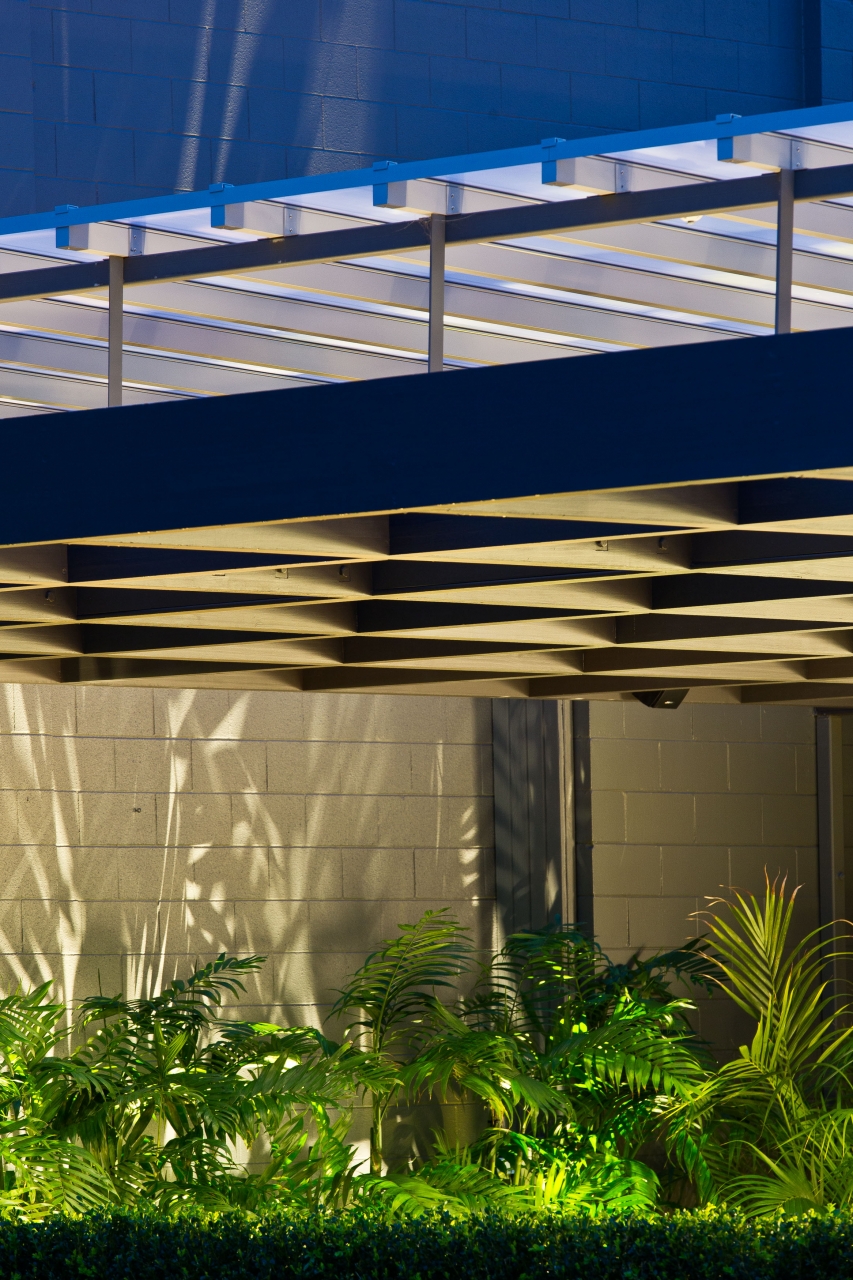 The resultant structure is one of minimal intrusion and maximum flexibility. The large cantilevering timber grille is lightly connected to the ground providing a base from which the waterproofing translucent polycarbonate roof element over is attached. The balustrades are constructed of sustainably grown yellow cedar with concrete pavers to the floor and bluestone treads.