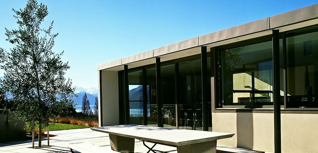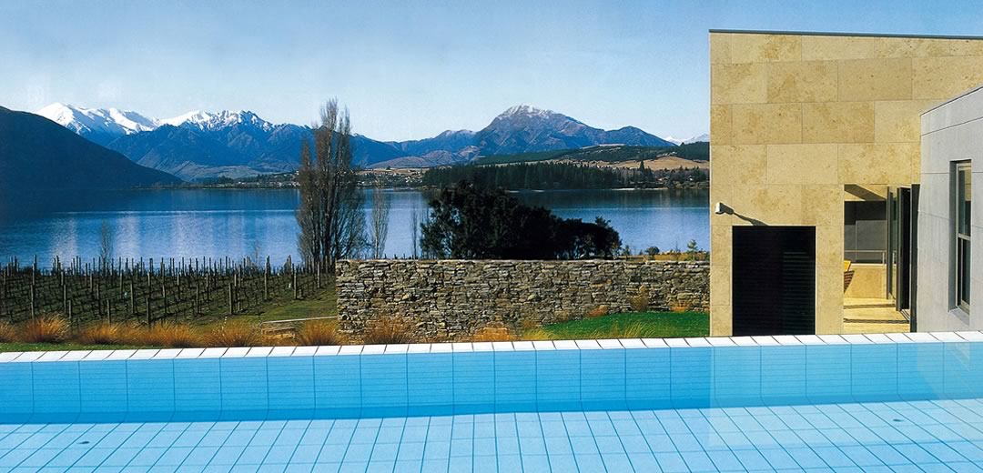 The orientation allows the building to provide sheltered areas around the house. A swimming pool is located on a higher level with good views from the kitchen and lounge for supervision of children using it. The guest bedroom is linked with the pool area and has expansive views across the pool to the vineyard and lake beyond.